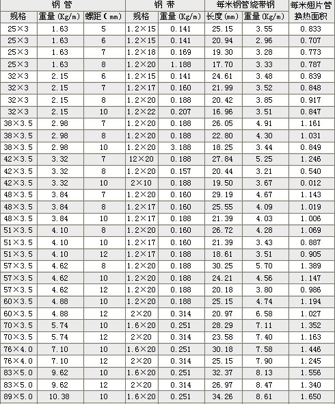 很多时候客户在选择我们螺旋翅片管的时候不知道该如何下手,其实很多时候并不是价格的翅片管就是的翅片管,关键是要适用。我们北溪空调的小编特地在网上搜索了一下有关高频焊螺旋翅片管规格介绍表,希望能在大家选购翅片管的时候有个准确的了解。以下参数表的材质为碳钢、不锈钢、基管、无缝管、焊管。